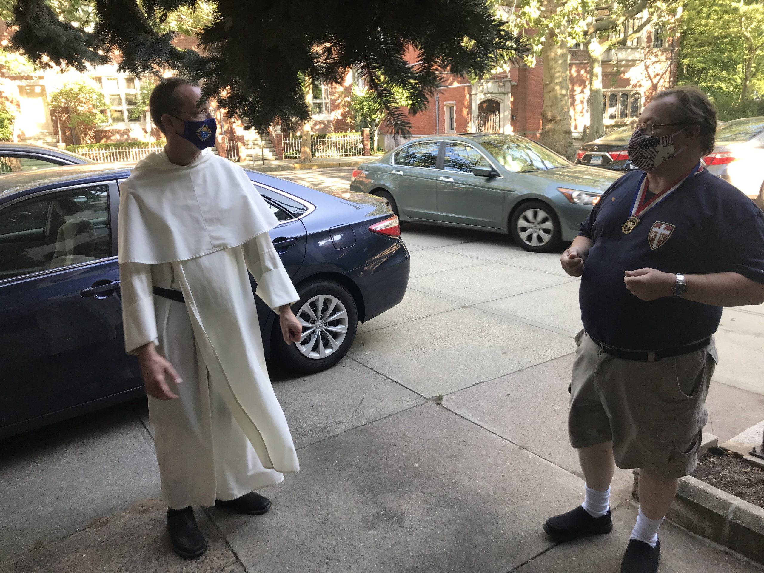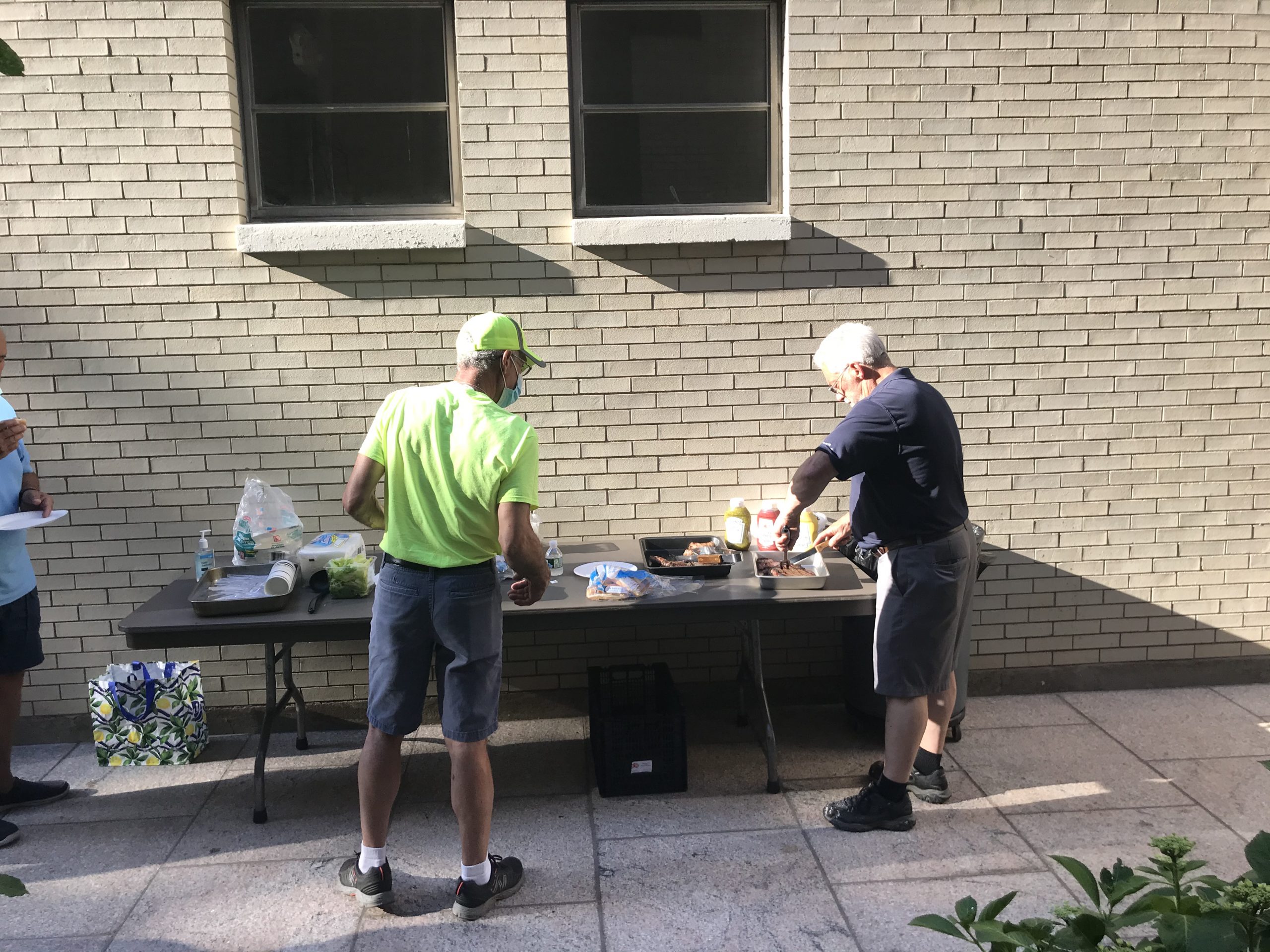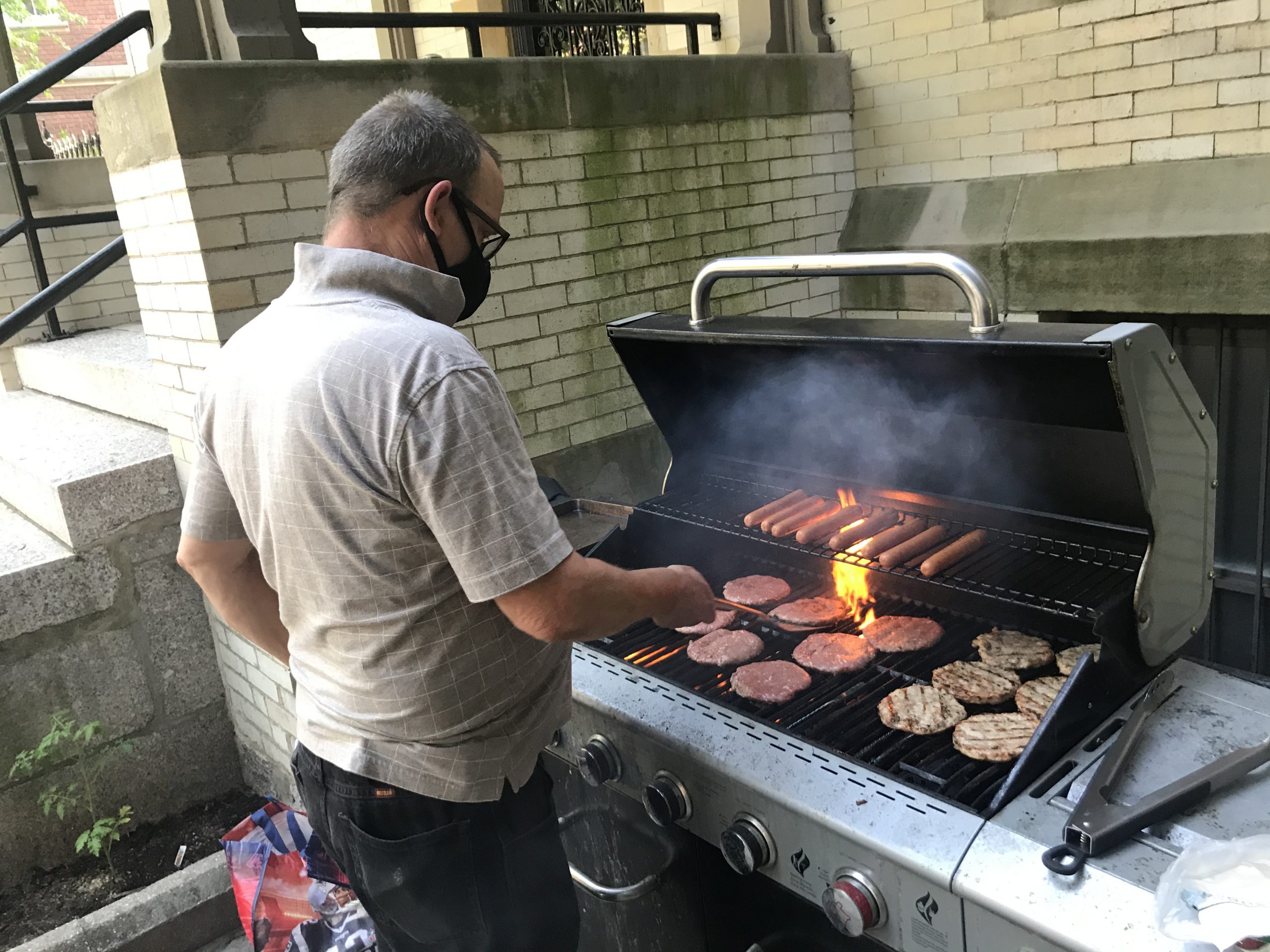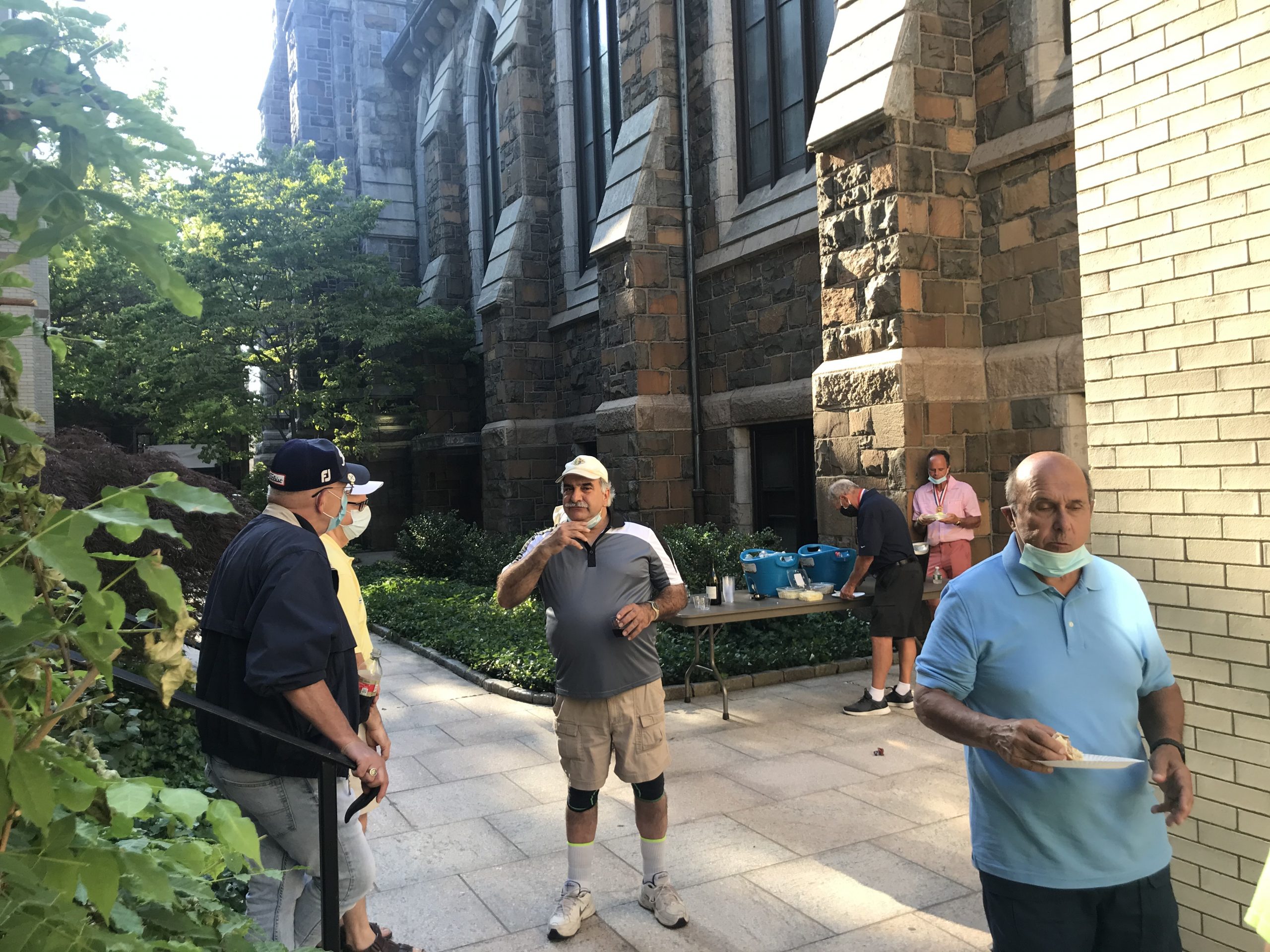 Social Meeting 6/23/2020 SK Gilbert Avery working that grill Fr. John Paul conversing with FN Mike Muttitt Maintaining Social Distancing “Who wants Sausage”””